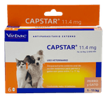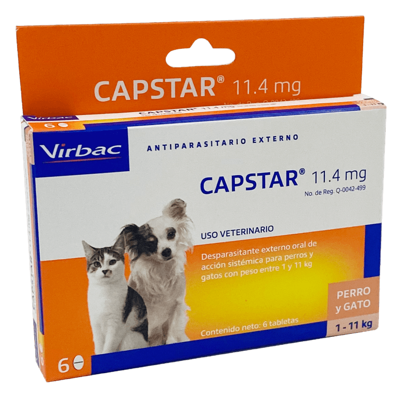 CAPSTAR® 11.4 mg Desparasitante externo oral de acción sistémica. Está indicado para el tratamiento de rápida acción contra pulgas adultas (Ctenocephalides felis y Ctenocephalides canis) en perros y gatos con peso entre 1 y 11 kg y mayores de 4 semanas de edad. Nitenpiram CAPSTAR® 57 mg está indicado para el tratamiento de rápida acción contra pulgas adultas (Ctenocephalides felis y Ctenocephalides canis) en perros con peso mayor a 11 kg. Nitenpiram