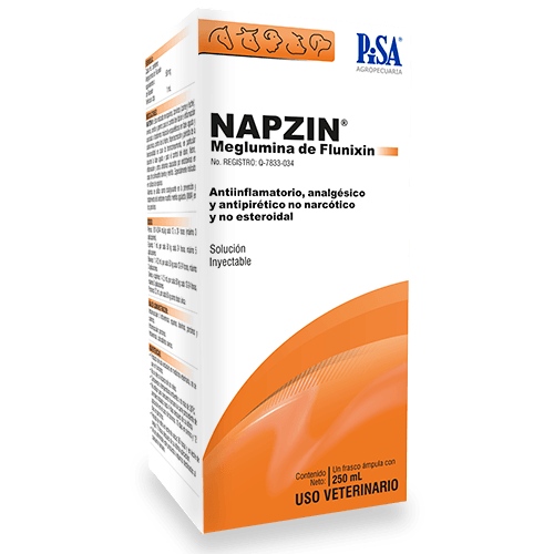 NAPZIN es un fármaco inyectable con acción analgésica, antiinflamatoria, y antipirética no esteroide que se indica en el tratamiento de endotoxemias y auxiliar en el tratamiento de enfermedades respiratorias, así como desordenes de los músculos esquelético y liso (traumatismos musculares, articulares, cólicos, mastitis, procedimientos posquirúrgicos, golpes, etc.), en bovinos, ovinos, caprinos, equinos, porcinos, perros y gatos. No es inmunosupresor y puede administrarse en animales de cualquier edad, estado fisiológico e incluso en hembras gestantes Meglubina de Flunixin